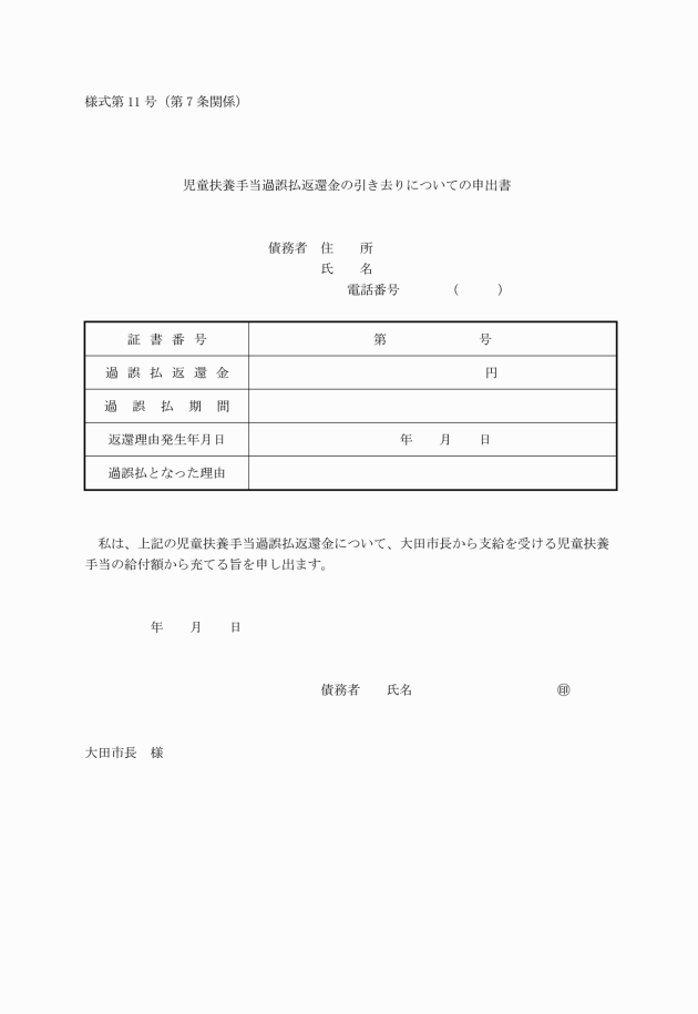 第7条 市長は、法第31条の規定に基づき、過誤払返還金をその後に支払う手当の内払い金とみなすことができる。この場合、債務者は、児童扶養手当過誤払返還金の引き去りについての申出書(様式第11号)を提出し、内払い金について申し出ることができる。